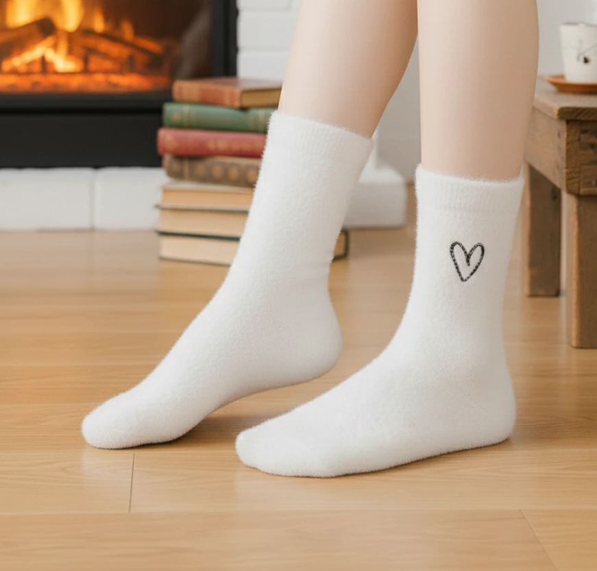 Une paire de chaussettes blanches à la texture « fluffy » ultra-douce, idéale pour garder les pieds bien au chaud avec un maximum de confort.