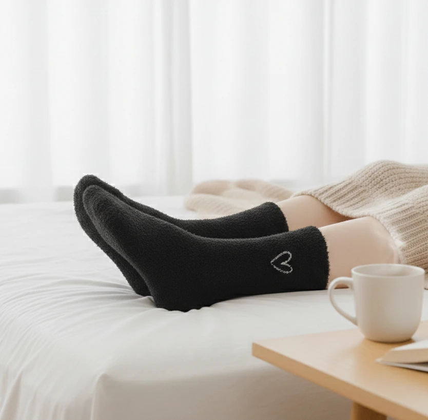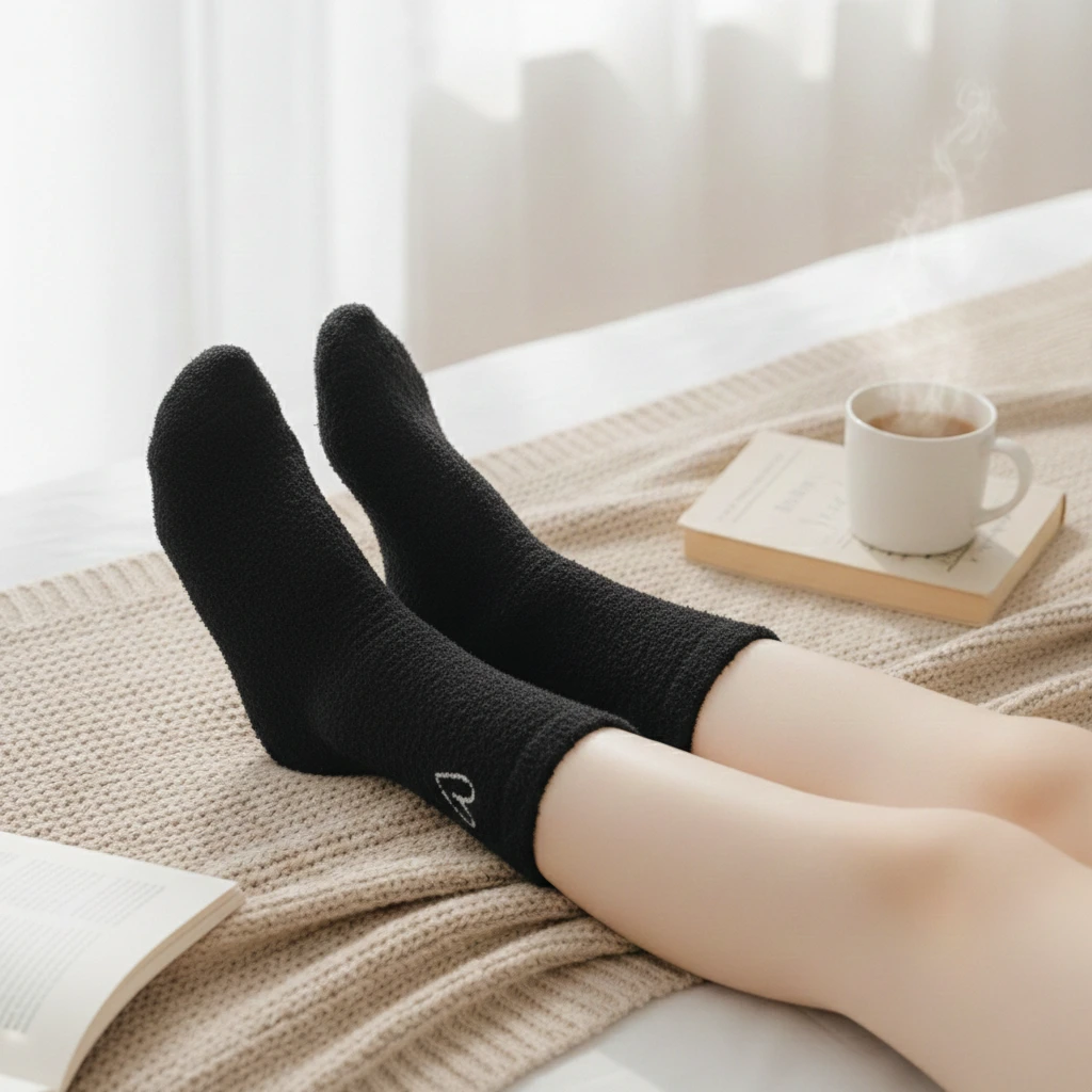Une paire de chaussettes noires à la texture « fluffy » ultra-douce, idéale pour garder les pieds bien au chaud avec un maximum de confort.